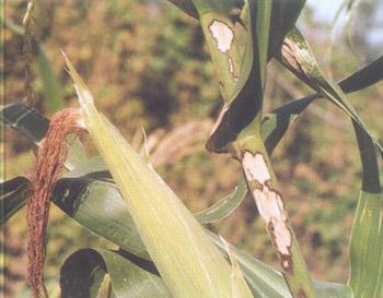 癥狀 紋枯病(俗稱"花腳稈","爛稈瘟")是近年來發(fā)生危害日益嚴(yán)重的一種新病害。四川省各地均有發(fā)生,以高溫、高濕條件下和夏播玉米發(fā)病較嚴(yán)重。其寄主甚廣,除危害玉米外,還可侵染水稻、小麥、大麥、高粱、棉花、大豆等多種作物。該病主要危害葉鞘,也可侵染葉片、苞葉和果穗,玉米拔節(jié)至成熟期均可發(fā)病。開始從莖基部的葉鞘感病,后侵染葉片并向植株上部蔓延。發(fā)病初期,光出現(xiàn)水漬狀灰綠色圓形或橢圓形病斑,后轉(zhuǎn)為白色至淡 黃色,發(fā)病后期,變?yōu)榧t褐色云紋狀斑 塊。當(dāng)濕度較大時,病斑上常長出許多白霉(菌絲和擔(dān)孢子);當(dāng)溫度較高或植株已老健不適合病菌擴大危害時,即產(chǎn)生菌核,多藏于葉鞘內(nèi)。菌核初為白色,老熟時呈褐色。葉鞘受害后,葉片萎蔫,嚴(yán)重時整株枯死,果穗受害后,可使苞葉干枯,果穗腐爛。